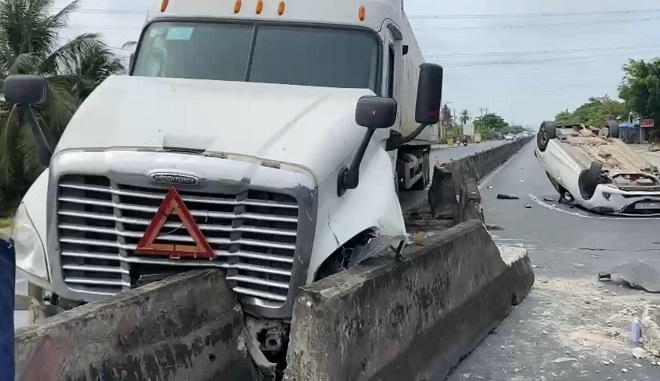 Cú va chạm mạnh khiến xe ô tô tông vào dải phân cách cứng giữ đường và lao sang phần đường ngược lại rồi lật ngửa. Chiếc xe đầu kéo sau khi va chạm với xe ô tô thì tiếp tục đâm vào dải phân cách trên đường rồi mới dừng lại.
