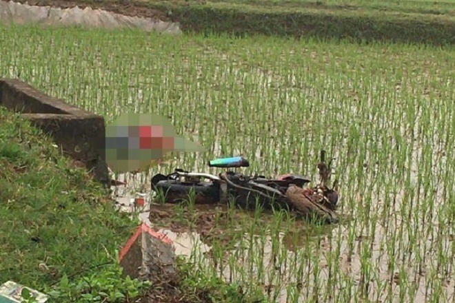 Tại hiện trường, nạn nhân tử vong trong tư thế nằm sấp mặt xuống ruộng lúa, bên cạnh là xe máy mang BKS 67K1- 694.51 bị hư hỏng nặng.