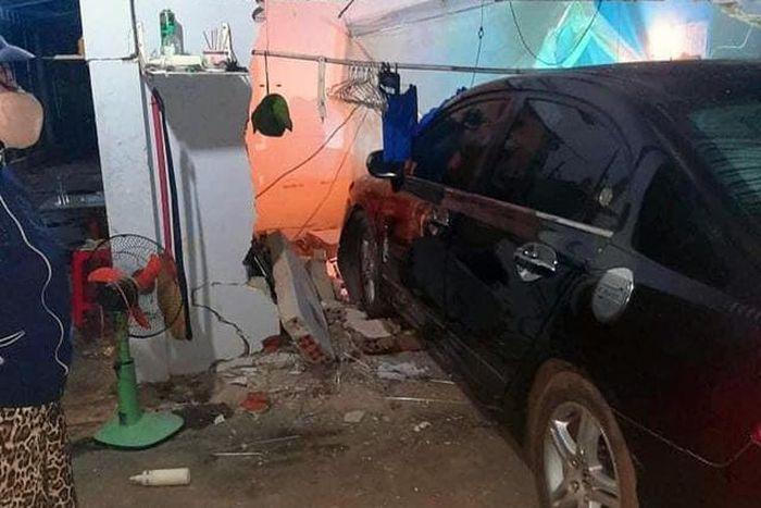Tại hiện trường, một bức tường của phòng nghỉ trong bị tông sập, ô tô bị hư hỏng phần đầu.