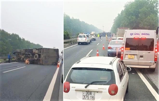 Còn tại Hà Nam, khoảng 6h45 xe tải mang BKS 20C - 175.44 chạy trên cao tốc Pháp Vân - Cầu Giẽ theo hướng Hà Nội đi Ninh Bình. Khi đến khu vực cách nút giao Liêm Tuyền khoảng 3km (đoạn thuộc TP Phủ Lý), chiếc xe này đâm vào dải phân cách rồi lật nghiêng chắn ngang đường.