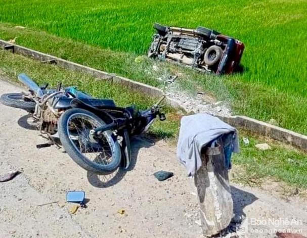 Cũng tại Nghệ An, khoảng 14h, xe ô tô bán tải BKS 37C- 388.35 lưu thông theo hướng từ xã Trung Sơn lên xã Đà Sơn (Đô Lương). Khi xe đến ngã ba giao nhau giữa tuyến đường tránh Quốc lộ 46 với tuyến đường vào xóm 2 (xã Trung Sơn, huyện Đô Lương) thì xảy ra va chạm với người điều khiển xe máy đi từ đường nhánh ở xóm 2 ra đường chính.