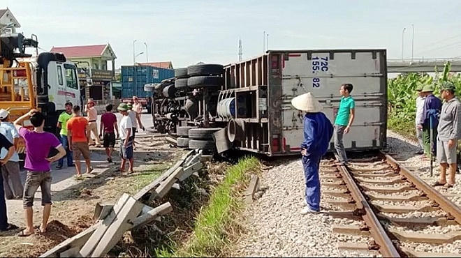 Xe tải húc bay dải phân cách nằm chắn ngang đường sắt