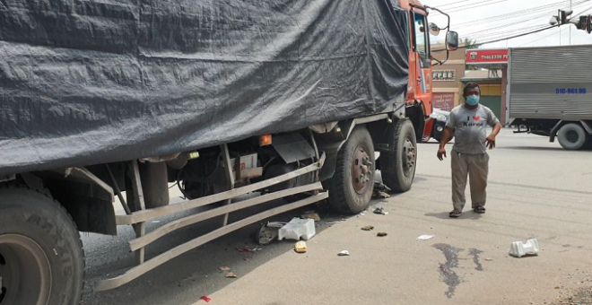 Sau va chạm, xe máy cùng người đàn ông bị cuốn vào gầm xe tải, nhập viện cấp cứu trong tình trạng nguy kịch. Tại hiện trường, xe máy nằm gọn dưới gầm xe tải hư hỏng nặng. Theo tài xế, thời điểm xảy ra tai nạn do xe máy đi vào điểm mù. Nhận tin báo, CSGT TP Thuận An đã có mặt để xử lí hiện trường vụ tai nạn.