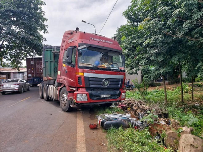 Tại hiện trường, 2 xe máy hư hỏng bị vùi dưới lớp đất, đầu xe và bánh trước gãy nát, chiếc container nằm chắn hết cả tuyến đường.