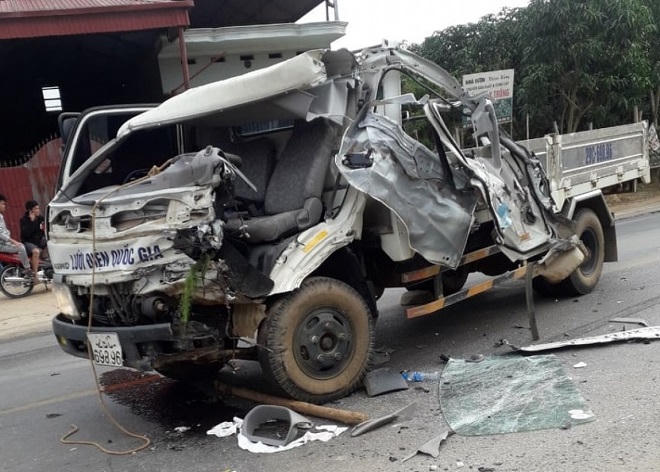 Cú đâm mạnh khiến cả 2 phương tiện hư hỏng nặng; trong đó, xe tải mang BKS 29C biến dạng, 2 người bị thương được đưa đi cấp cứu.