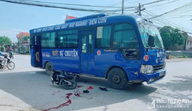 Chiếc xe buýt BKS 37B – 015xx đang chở khách lưu thông hướng Nam - Bắc, khi vừa đến ngã tư Quỳnh Bảng thì bất ngờ va chạm với xe máy chở 3 nam thanh niên. Cú va chạm mạnh khiến xe máy lọt vào gầm xe buýt vỡ nát, 3 nam thanh niên văng xuống đường chấn thương hết sức nguy kịch.