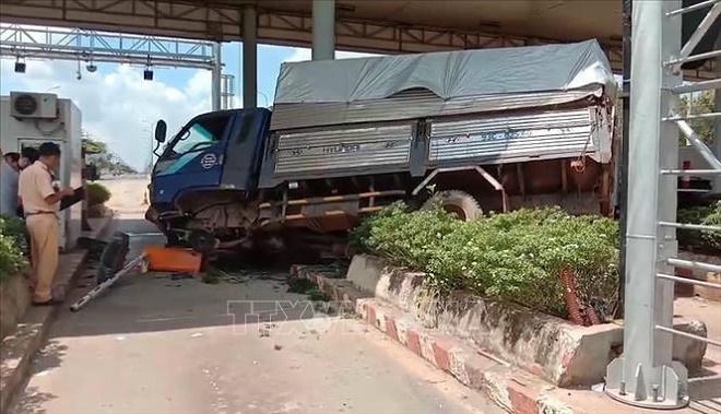 Xe tải mất lái lao vào trạm thu phí