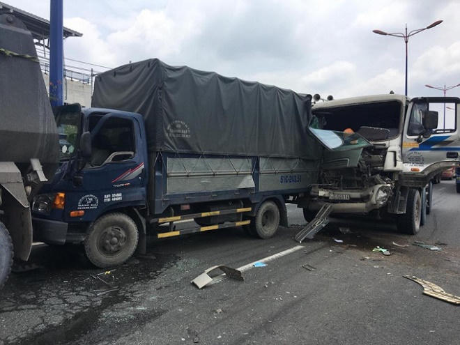 Còn tại TP HCM, khoảng 10h30’, xe ben BKS 51C-548xx lưu thông trên xa lộ Hà Nội (hướng từ Đồng Nai về TP HCM) đang đổ dốc cầu vượt Thủ Đức (thuộc phường Bình Thọ, quận Thủ Đức) thì tông vào đuôi xe tải BKS 51C-243xx đang lưu thông phía trước.