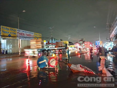 Khi tới gần cổng Khu công nghiệp Visip (phường An Phú, TP Thuận An) thì đường ngập nước, chị B không quan sát được nên bị sụp ổ gà ngã ra đường.