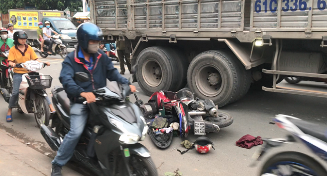 Đúng lúc này xe tải mang BKS 61C-336xx chạy cùng chiều tới và xe máy đã lao vào hông xe tải. Cú va chạm khiến 2 người đàn ông ngã xuống đường bị thương nặng phải nhập viện cấp cứu.