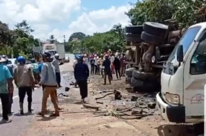 Tại hiện trường, hàng tấn phân bò trên xe tải bị nạn đổ tung toé ra ngoài. Chiếc xe tải gây tai nạn bị hư hỏng nặng, bánh xe và cầu trước của xe bung ra ngoài. Chiếc ô tô tải đậu bên lề đường cũng bị đâm dập nát phần thân xe.