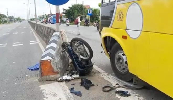 Vụ va chạm chạm khiến xe máy cùng người đàn ông ngã xuống đường. Xe khách còn đẩy lê xe máy dưới đường khiến chiếc xe máy bị lật ngửa rồi dính chặt vào dải phân cách cứng trên đường.