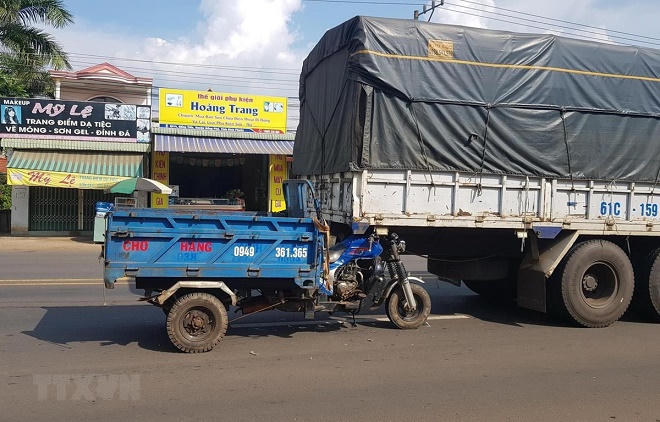 Cùng lúc này, chiếc xe ba gác do ông Nguyễn Văn An (34 tuổi, ngụ TP Đồng Xoài) điều khiển, từ phía sau đuôi xe tải lao tới.