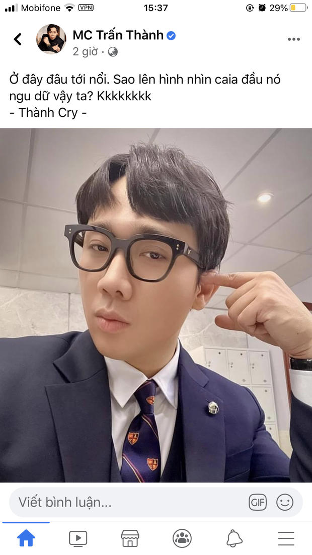Dù vậy, Trấn Thành vẫn không ngừng bị gọi tên khắp nơi. Đứng trước những ý kiến trái chiều, "A Xìn" đã có động thái bất ngờ trên trang Facebook của mình. Đăng kèm một bức ảnh selfie, anh tự nhận mình theo nickname dân mạng đặt cho: "Ở đây đâu tới nổi. Sao lên hình nhìn cái đầu nó ngu dữ vậy ta? - Thành Cry -"