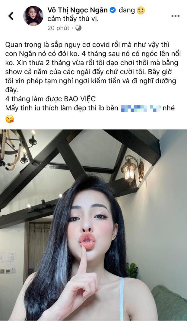 Ngay sau đó, Ngân 98 đã có động thái phản hồi trên trang cá nhân: "Quan trọng là sắp nguy cơ Covid rồi mà như vậy thì con Ngân nó có đói không. 4 tháng sau nó có ngóc lên nổi không. Xin thưa 2 tháng vừa rồi tôi dạo chơi thôi mà bằng show cả năm của các ngài đấy chứ cười tôi. Bây giờ tôi xin phép tạm nghỉ ngơi kiếm tiền và đi nghỉ dưỡng đây. 4 tháng làm được bao việc!".