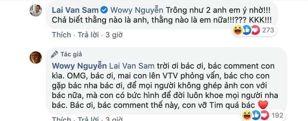 Để đáp lại tấm chân tình của Wowy, đích thân MC Lại Văn Sâm đã vào trang cá nhân của nam rapper để bình luận: "Trông như 2 anh em ý nhờ. Chả biết thằng nào là anh, thằng nào là em nữa". Tất nhiên, Wowy cũng nhanh chóng đáp lại và còn mong có cơ hội được chụp ảnh chung với MC đình đám để có hình "để đời" khoe với mọi người.