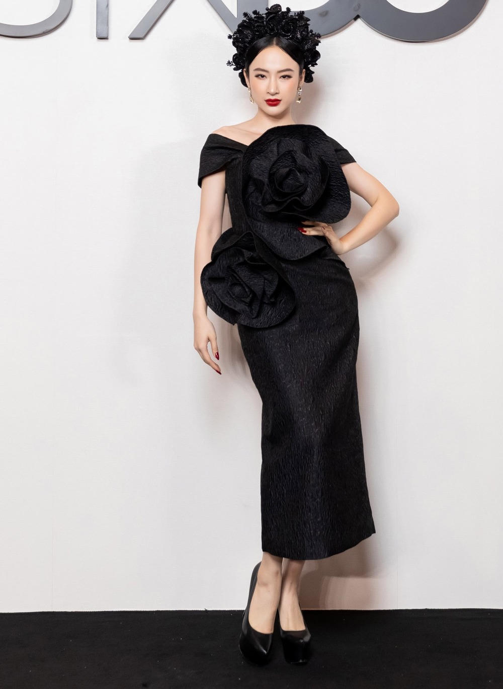 Tối 24/10, Angela Phương Trinh đăng tải trên trang cá nhân chuỗi hình ảnh khác hẳn ngày thường. Cô son phấn đậm nét, khoác bộ đầm đen kiêu sa, đội mấn với tạo hình độc đáo dự show thời trang của Đỗ Mạnh Cường.