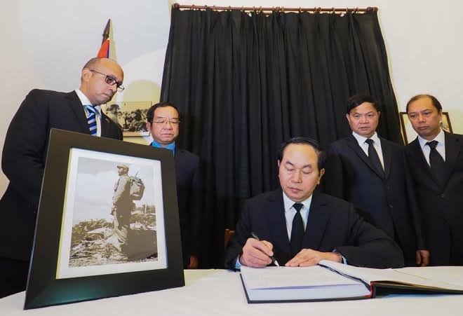 | Chủ tịch nước Trần Đại Quang đã đến đặt vòng hoa viếng, ghi sổ tang tưởng niệm cựu Chủ tịch Fidel Castro. |