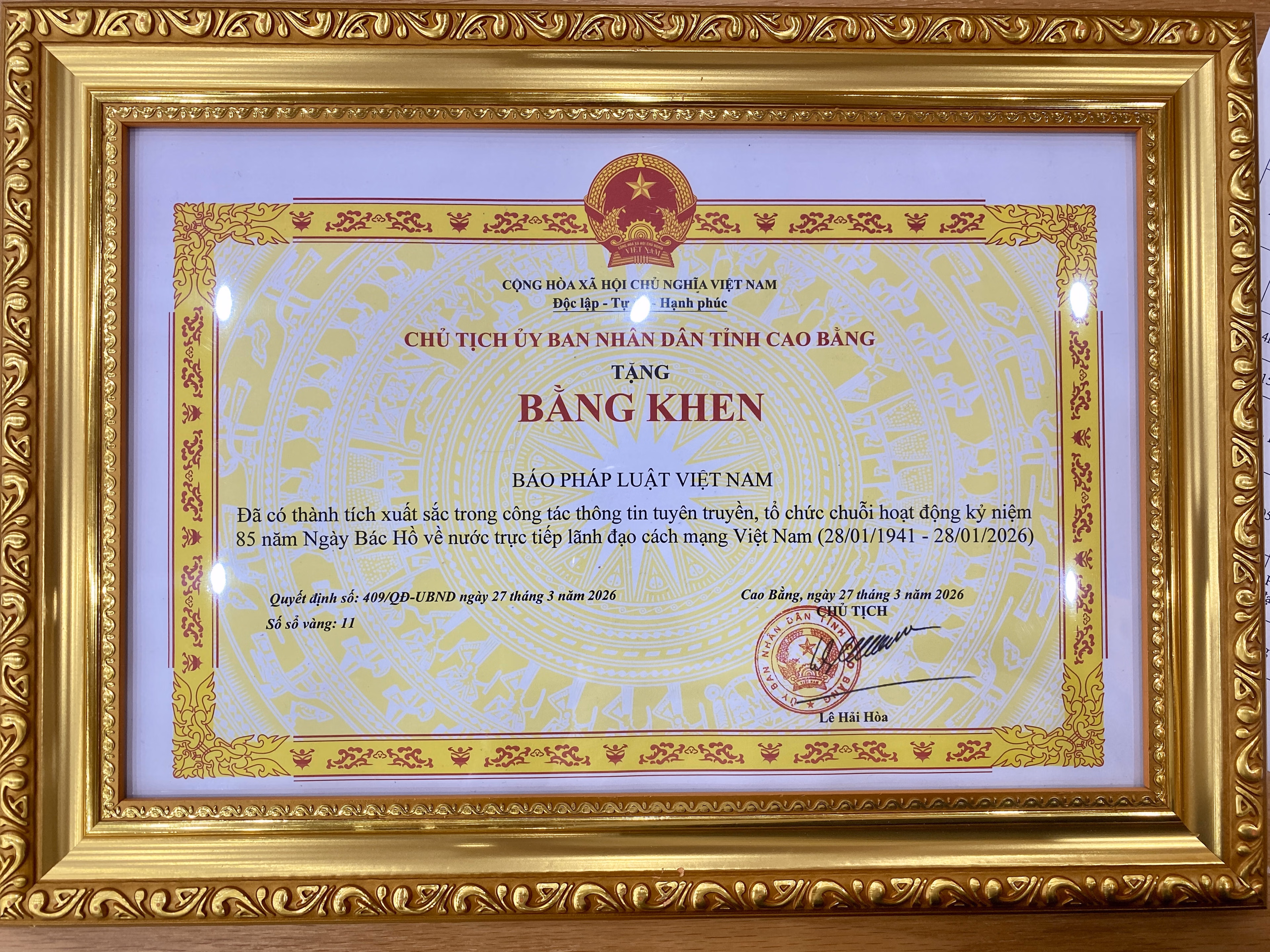 (PLVN) - Trong khuôn khổ Hội nghị sơ kết Đề án số 01-ĐA/TU của Tỉnh ủy Cao Bằng, Báo Pháp luật Việt Nam đã vinh dự được Chủ tịch UBND tỉnh tặng Bằng khen vì những thành tích xuất sắc trong công tác thông tin, tuyên truyền về chuỗi hoạt động kỷ niệm 85 năm ngày Bác Hồ về nước trực tiếp lãnh đạo cách mạng Việt Nam.
