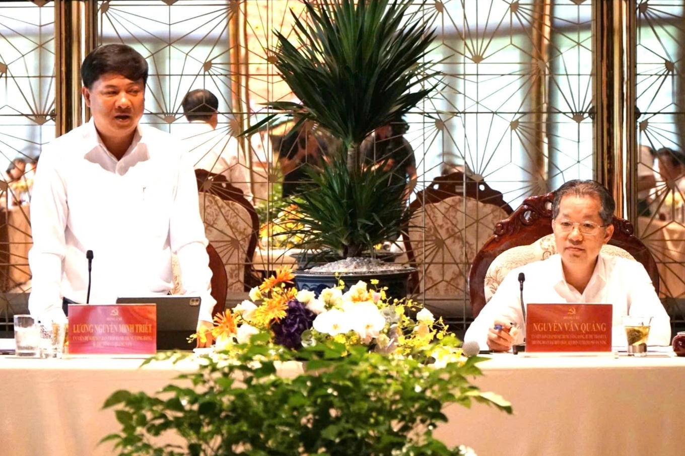 Ông Nguyễn Văn Quảng, Bí thư Thành ủy Đà Nẵng và ông Lương Nguyễn Minh Triết, Bí thư Tỉnh ủy Quảng Nam chủ trì hội nghị (Ảnh: Dũng Quốc). |