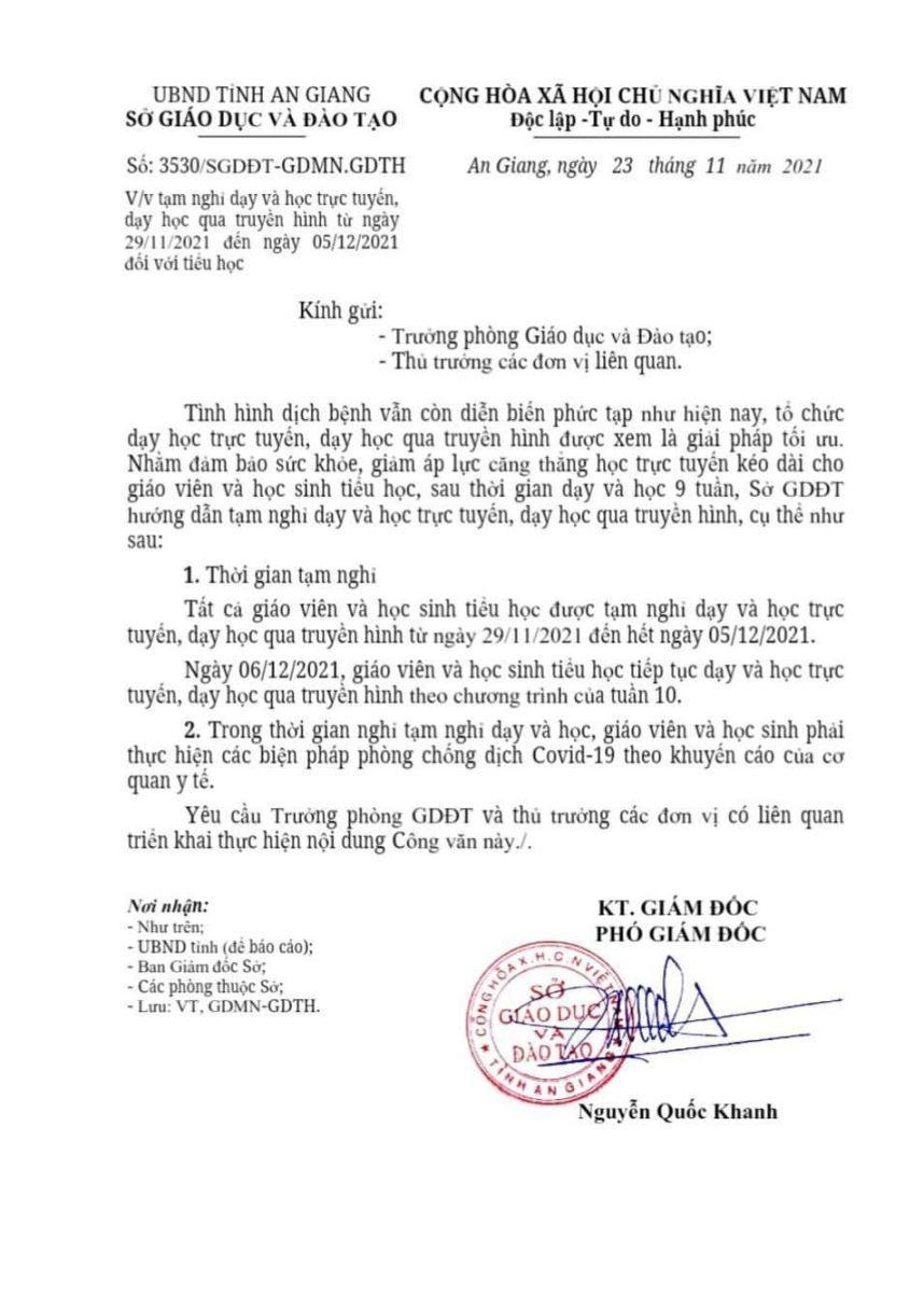 Sở Giáo dục và Đào tạo An Giang vừa có công văn về việc tạm nghỉ dạy và học trực tuyến, dạy học qua truyền hình từ ngày 29/11 đến ngày 5/12/2021 với bậc tiểu học.