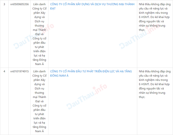 Đặc biệt, trong 3 nhà thầu bị loại này, Liên danh công ty Cổ phần Xây dựng và Dịch vụ thương mại Thành Đạt (Công ty Thành Đạt) – Công ty Cổ phần đầu tư phát triển điện lực và hạ tầng Đông Nam Á bị phát hiện kê khai hợp đồng nguyên tắc và nhân sự không trung thực.