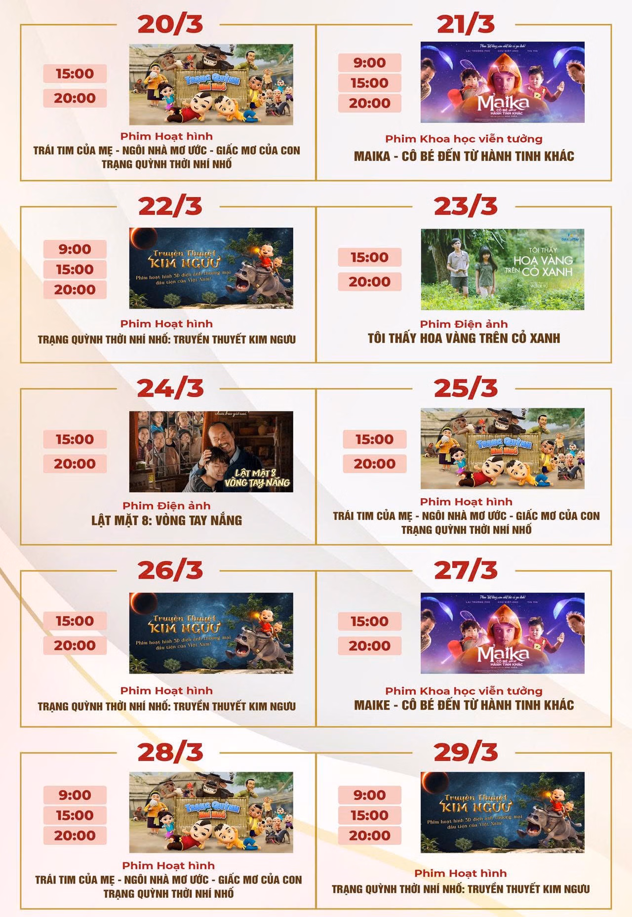 Theo kế hoạch, Tuần phim “Hạnh phúc cho mọi gia đình” sẽ diễn ra từ ngày 20/3 đến 29/3 tại Hội trường Bảo tàng - Thư viện tỉnh Quảng Ninh (phường Hạ Long). Mỗi ngày có 2 suất chiếu vào buổi chiều và buổi tối; riêng Thứ 7 và Chủ nhật tăng lên 3 suất, bổ sung suất buổi sáng. Mỗi suất chiếu phục vụ khoảng 300 khán giả, dành cho cán bộ, công chức, viên chức, người lao động, học sinh, sinh viên, lực lượng vũ trang, Nhân dân trên địa bàn và du khách.