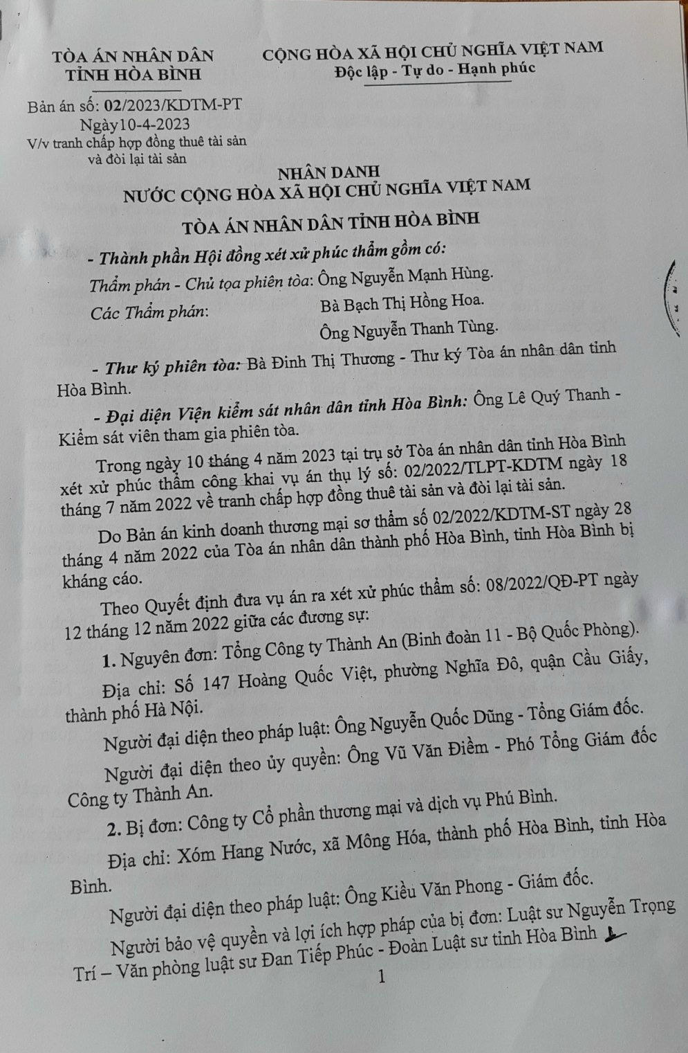 Xét xử sơ thẩm, TAND TP Hòa Bình chấp nhận yêu cầu của nguyên đơn; tuyên hợp đồng vô hiệu; buộc Cty Phú Bình trả lại đất, cùng tài sản trên đất.
