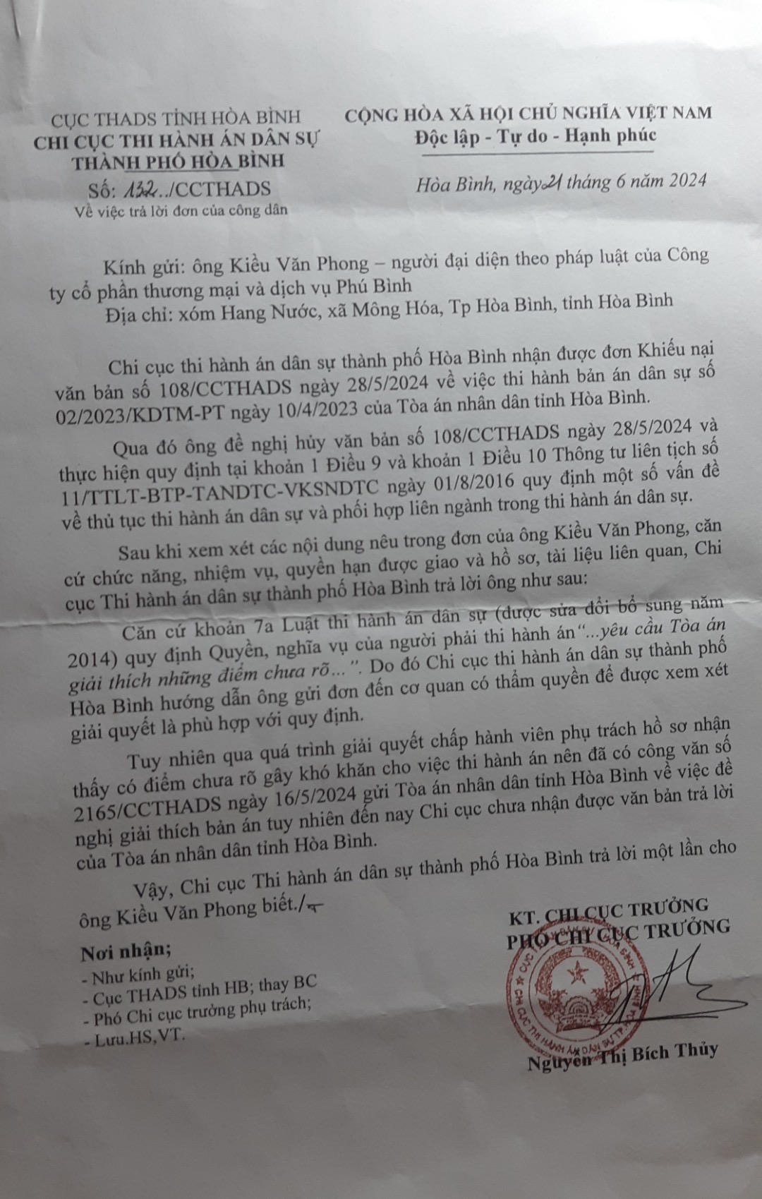 Trong quá trình thi hành bản án, ngày 21/6/2024, Chi cục THADS TP Hòa Bình đã có văn bản gửi đương sự, cho biết bản án có điểm chưa rõ, gây khó khăn; nên Chi cục đã có công văn gửi TAND tỉnh Hòa Bình đề nghị giải thích bản án, nhưng chưa nhận được trả lời.