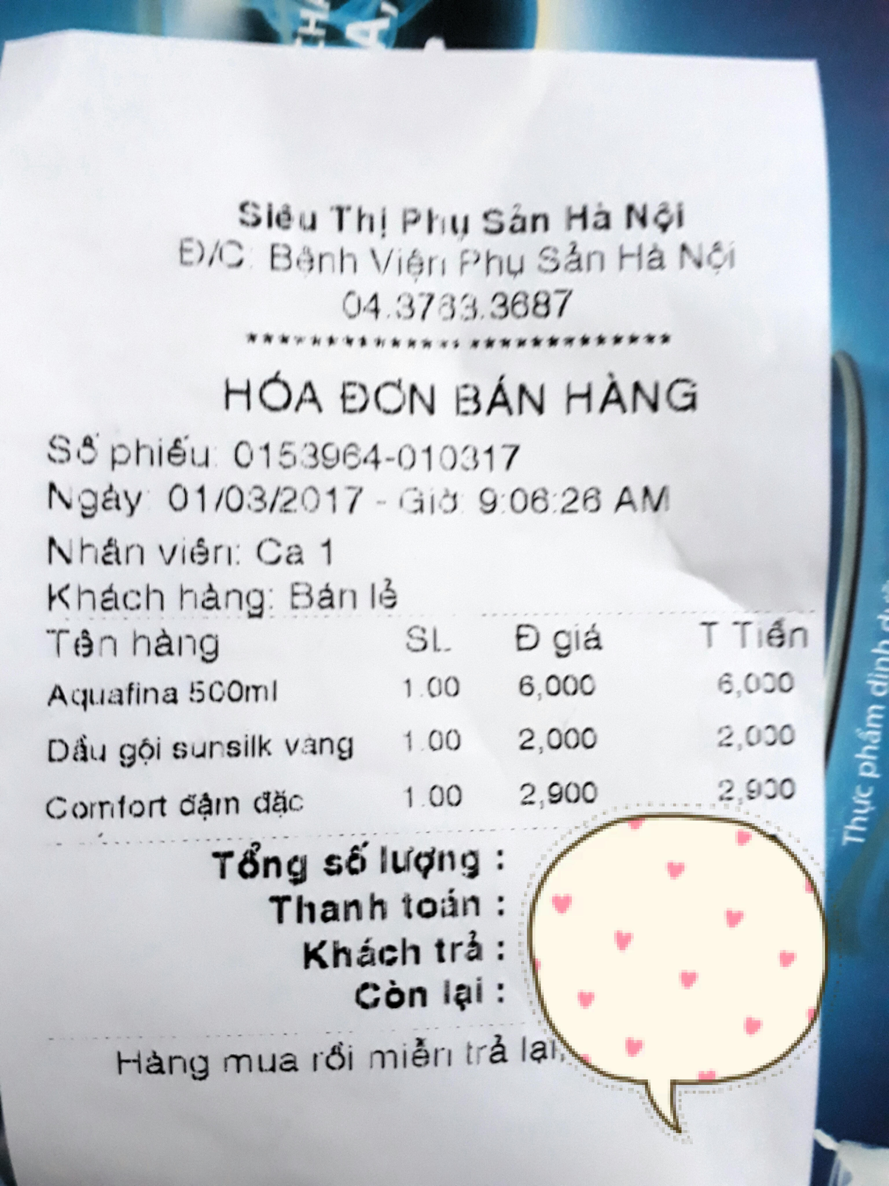 Chị chia sẻ: 1 lốc sữa Fami bên ngoài bán với giá 26.000 đồng thì trong bệnh viện bán với giá 30.000 đồng. Một chai nước Lavie 500ml bán với giá 6.000 đồng/chai trong khi của hàng tạp hóa bên ngoài bán dao động từ 4.000 đến 5.000 đồng/chai. Bỉm dán bobby M26 trong cửa hàng tiện ích bệnh viện bán với giá 107.000 đồng (bên ngoài bán với giá 98.000 đồng). Bỉm bobby XL21 trong cửa hàng tiện ích bệnh viện bán với giá 107.000 đồng (bên ngoài bán với giá 97.000 đồng) Giấy vệ sinh Posy bán 8.000 đồng/cuộn (bên ngoài 1 bịch 10 cuộn bán với giá 53.000 đồng tướng ứng 5.300 đồng/ cuộn)