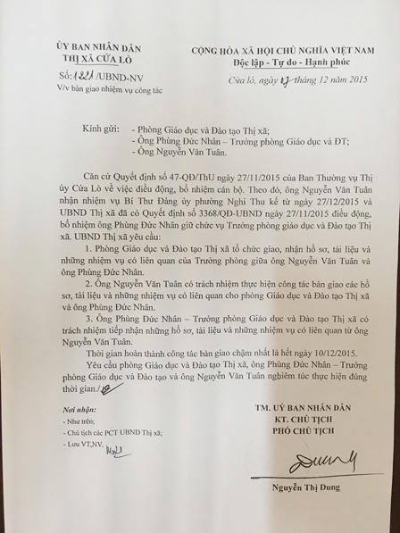 Trước đó, Phó Chủ tịch UBND thị xã Cửa Lò đã ký công văn yêu cầu ông Tuân bàn giao các hồ sơ, tài liệu và những nhiệm vụ có liên quan cho người kế nhiệm là ông Phùng Đức Nhân, chậm nhất là hết ngày 10/12.