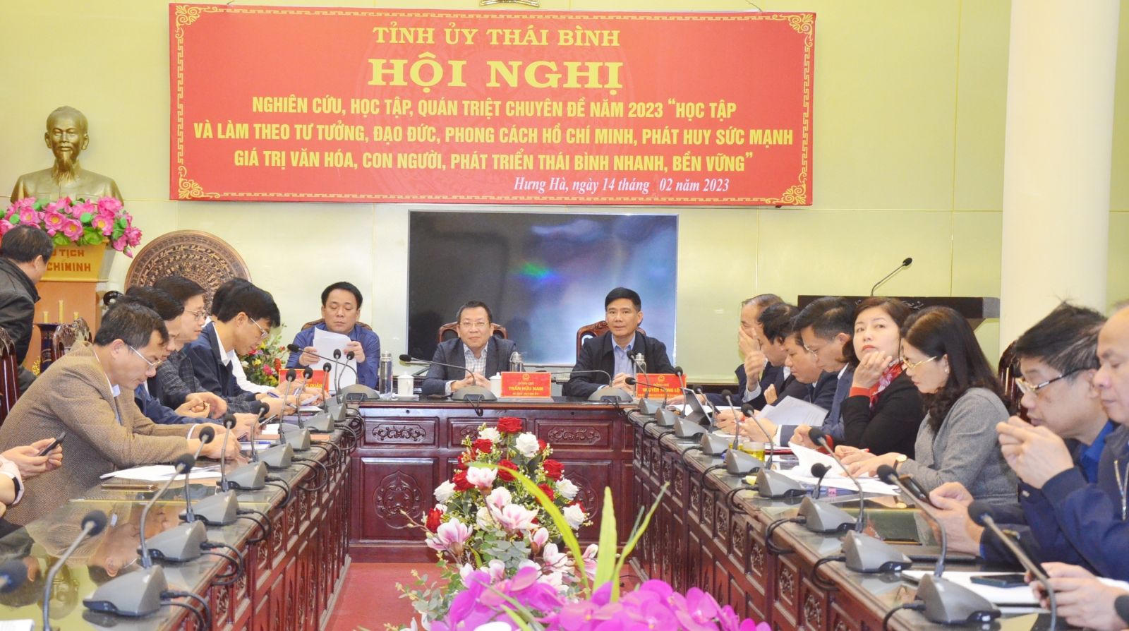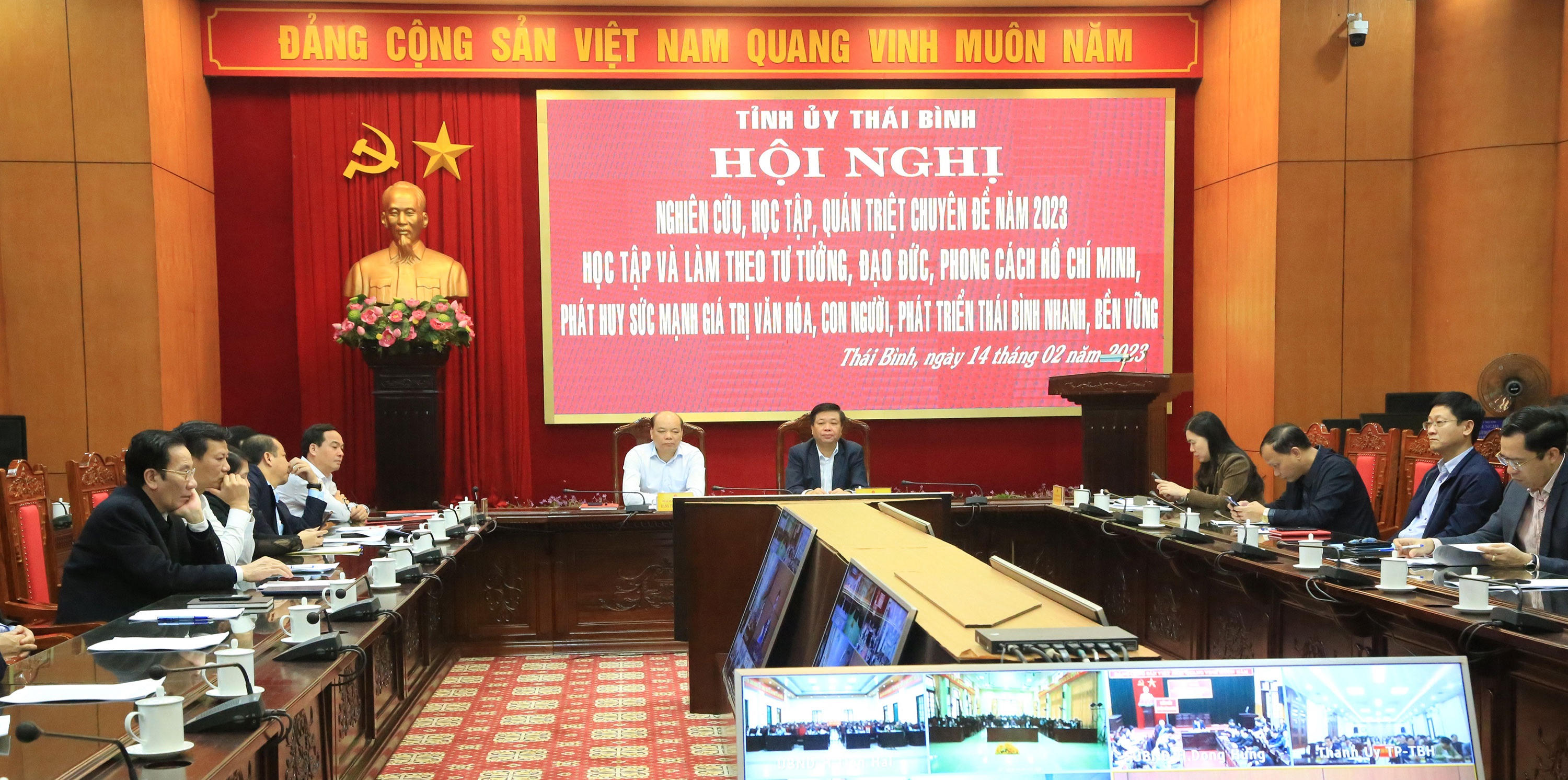 (PLVN) - Ngày 14/2, Tỉnh ủy Thái Bình tổ chức hội nghị trực tiếp kết hợp trực tuyến, nghiên cứu, học tập, quán triệt, tuyên truyền, triển khai thực hiện chuyên đề năm 2023: “Học tập và làm theo tư tưởng, đạo đức, phong cách Hồ Chí Minh, phát huy sức mạnh giá trị văn hóa, con người, phát triển Thái Bình nhanh, bền vững”.