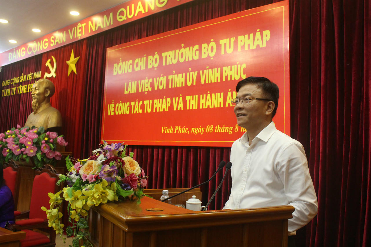 Bí thư Tỉnh ủy Hoàng Thị Thúy Lan bày tỏ sự vui mừng được đón tiếp Bộ trưởng và Đoàn công tác về thăm và làm việc tại Vĩnh Phúc. Chuyến thăm thể hiện sự quan tâm của Bộ trưởng với công tác tư pháp, THADS trên địa bàn tỉnh. Nhân buổi làm việc, Thường trực Tỉnh ủy cũng báo cáo với Bộ trưởng một số khó khăn, vướng mắc và kiến nghị trong lĩnh vực thu hút đầu tư, đất đai, đầu tư công và xây dựng cơ bản.