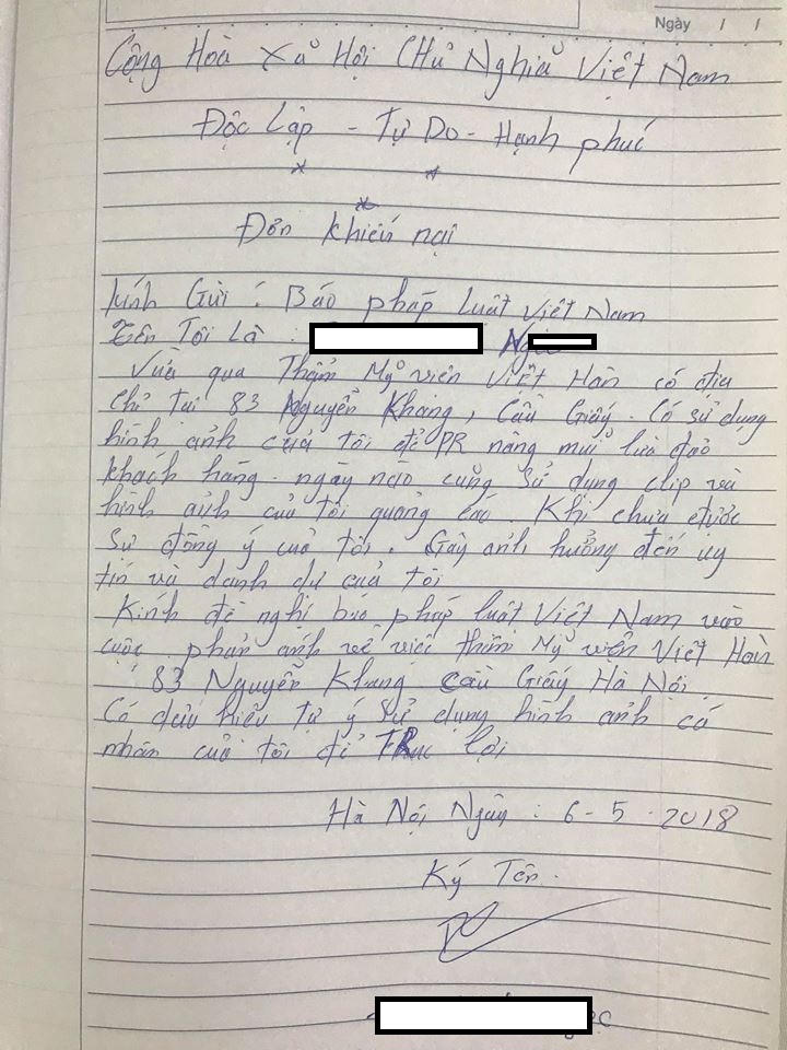 (PLO) - Mới đây, bạn đọc Đ.M.N phản ánh tới báo PLVN về việc Thẩm mỹ viện (TMV) Việt Hàn có địa chỉ tại số 83 Nguyễn Khang, Cầu Giấy, Hà Nội có sử dụng hình ảnh của chị để quảng cáo các phương pháp làm đẹp khi chưa được chị đồng ý.