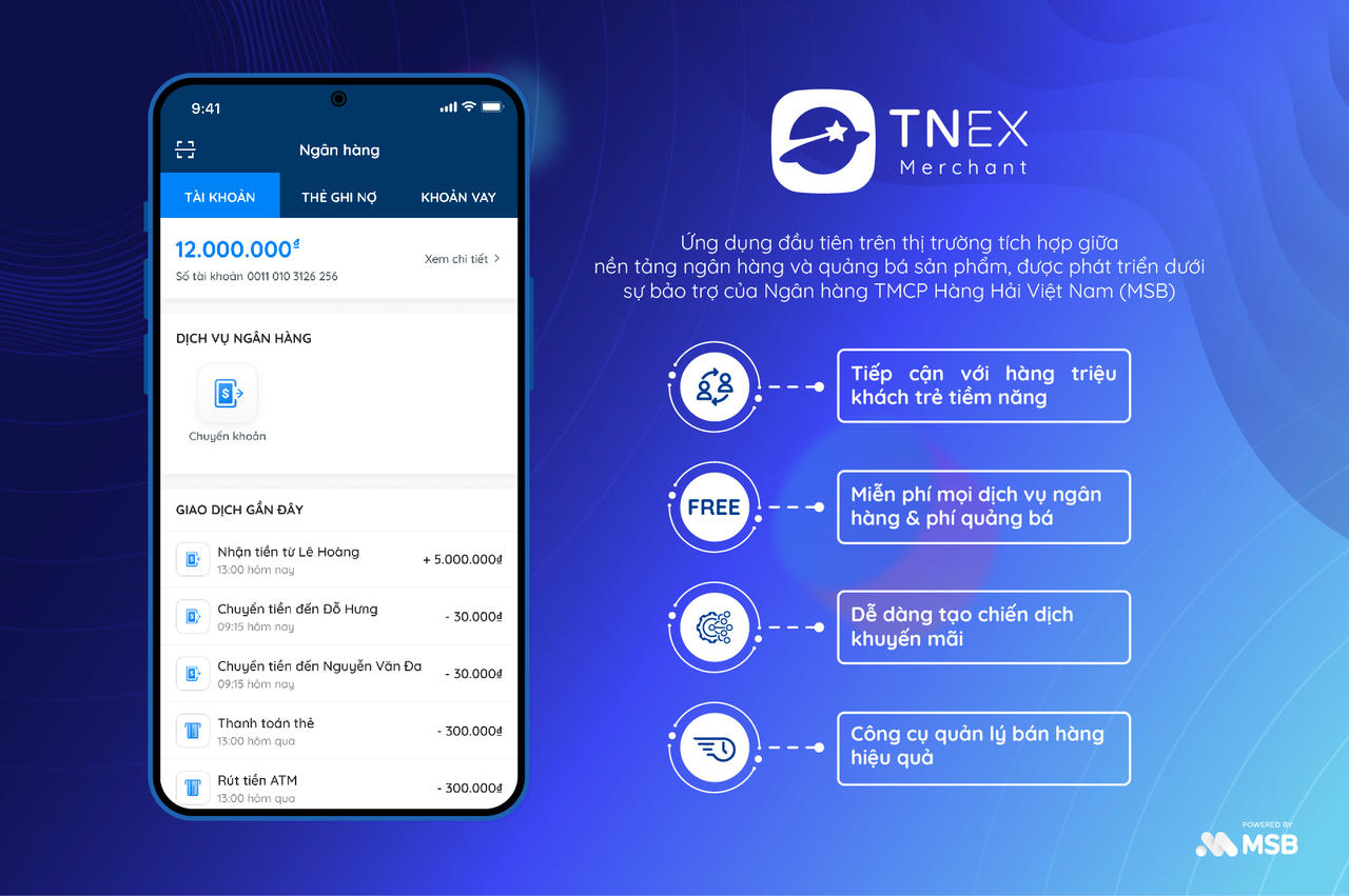(PLVN) - TNEX là nền tảng ngân hàng thuần số và hệ sinh thái dành cho Chủ cửa hàng và Người tiêu dùng đầu tiên tại Việt Nam được bảo trợ bởi Ngân hàng TMCP Hàng Hải Việt Nam (MSB). Hệ sinh thái TNEX bao gồm ứng dụng TNEX cho khách hàng cá nhân và TNEX Merchant cho khách hàng đại lý