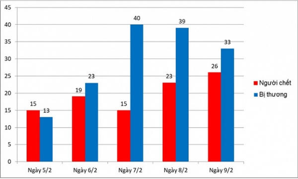 Theo Báo cáo của Văn phòng Bộ Công an, ngày 8/2 (mùng 4 Tết), xảy ra 37 vụ TNGT đường bộ, làm chết 23 người, bị thương 39 người. Tổng số 8 ngày nghỉ Tết cả nước đã xảy ra 248 vụ TNGT làm 161 người chết, 222 người bị thương .
