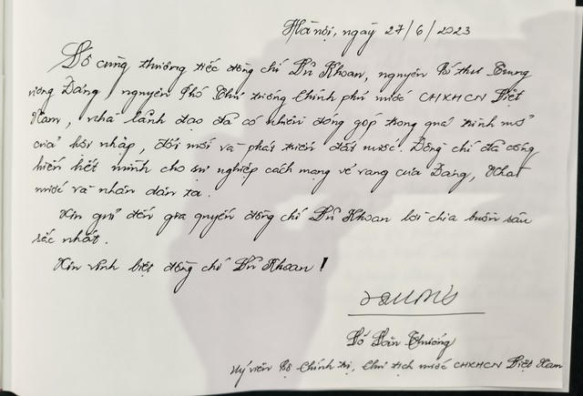 Vĩnh biệt đồng chí, chúng tôi nguyện chung sức đồng lòng hiện thực hóa khát vọng xây dựng đất nước phồn vinh, hạnh phúc!"