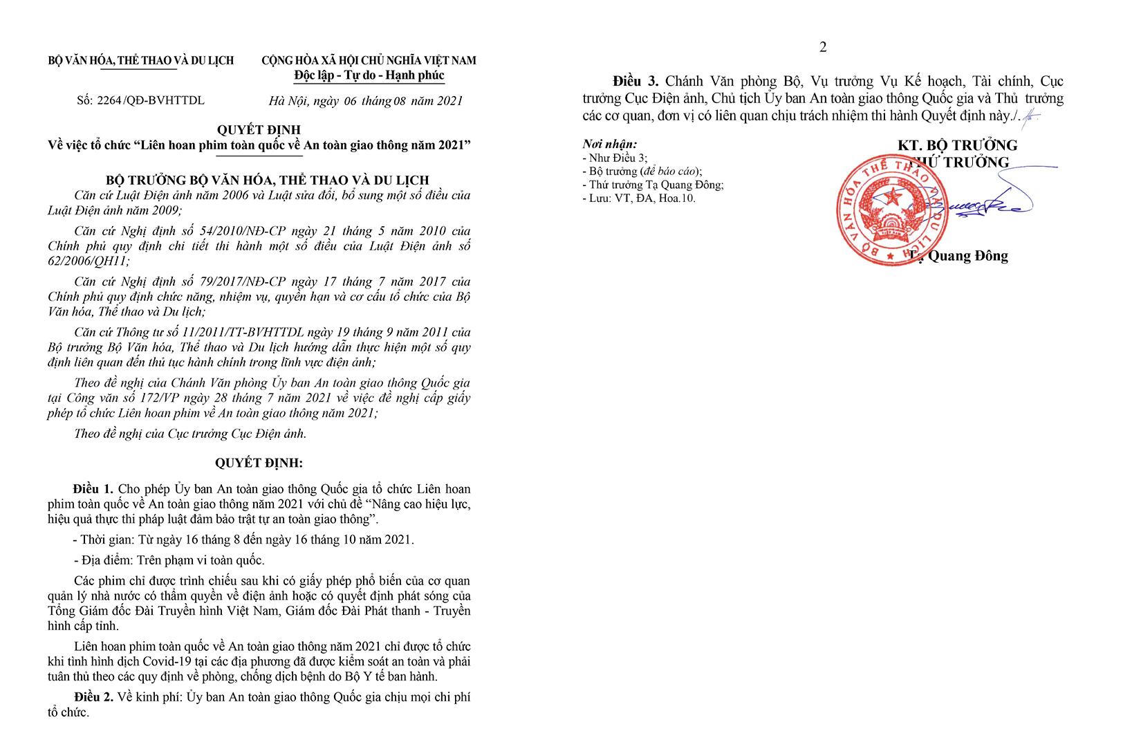 Quyết định số 2264/QĐ-BVHTTDL về việc tổ chức Liên hoan phim toàn quốc về An toàn giao thông năm 2021 |