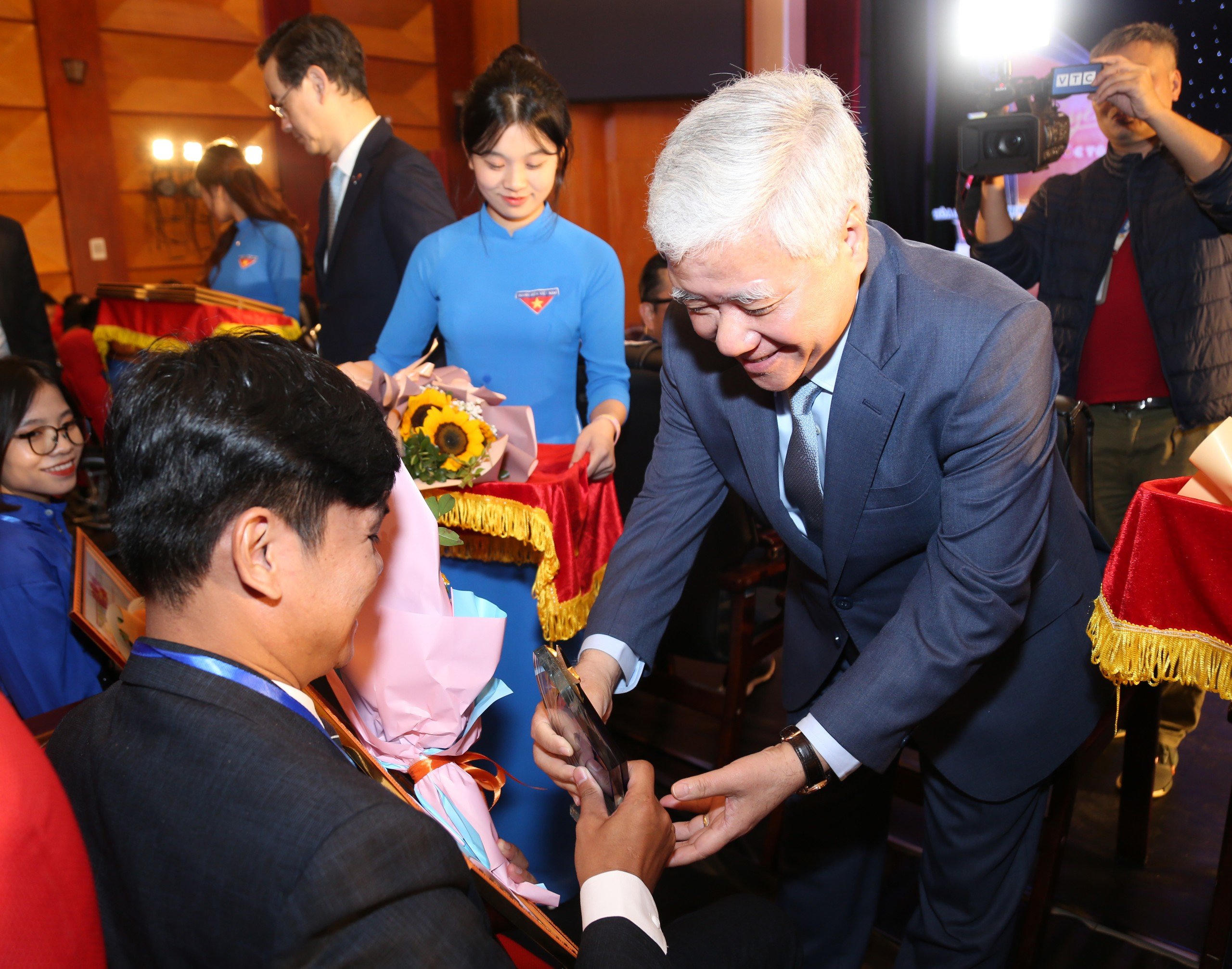 Ông Đỗ Văn Chiến - Chủ tịch Ủy ban Trung ương Mặt trận Tổ quốc Việt Nam trao bằng khen cho gương thanh niên Tỏa sáng Nghị lực Việt 2023. Ảnh BTC. |