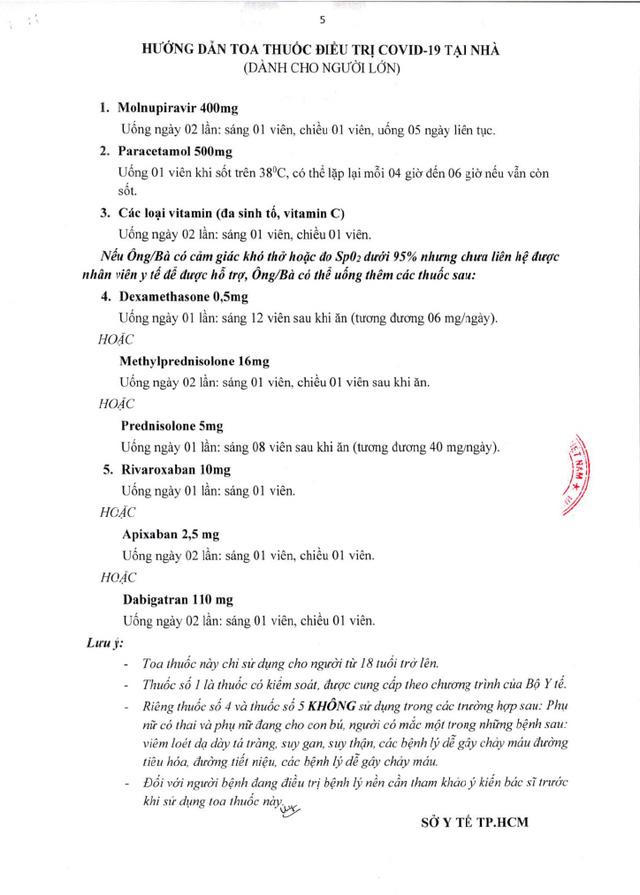 Theo toa thuốc điều trị COVID-19 tại nhà được cung cấp, Sở Y tế TP HCM chia sẻ các thuốc điều trị tại nhà bao gồm: thuốc hạ sốt, thuốc nâng cao thể trạng (vitamin, chất dinh dưỡng vi lượng, các thuốc y học cổ truyền), thuốc kháng virus, thuốc kháng viêm corticoid và kháng đông dạng uống trong một số trường hợp nhất định.