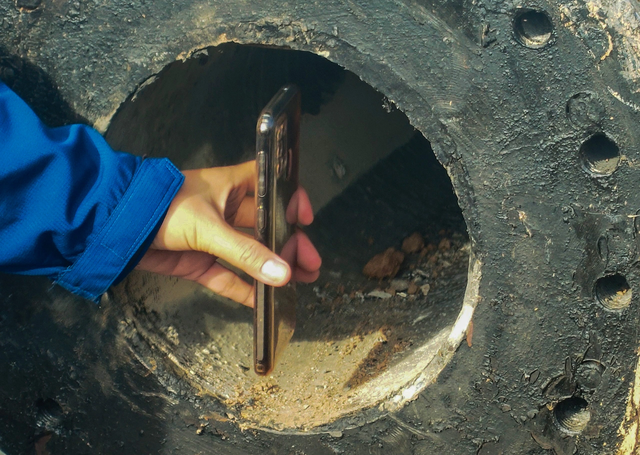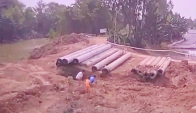 Khoảng 11h30 ngày 31/12, bé Thái Lý Hạo Nam trong lúc vào công trình cầu Rọc Sen nằm trên đường tỉnh lộ 857, xã Phú Lợi để nhặt sắt thì không may rơi xuống trụ bê tông rỗng ruột bên trong, đã đóng xuống đất sâu khoảng 35m. Ảnh cắt từ clip.