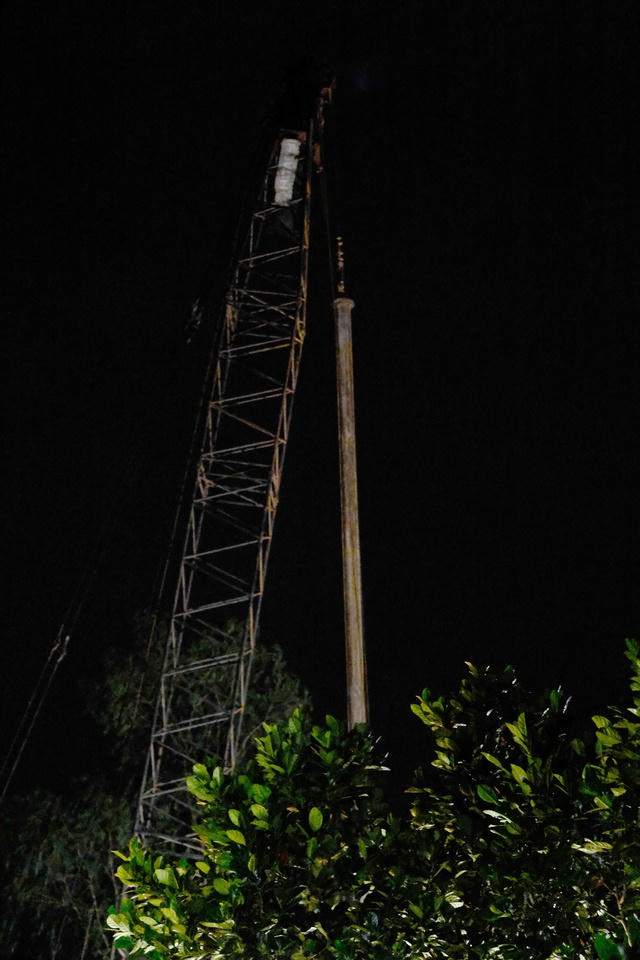 Đêm 1/1, khi có thiết bị chuyên dụng trên, lực lượng cứu hộ bắt đầu khoan nhồi với lực đóng 35 tấn kèm với chức năng hút bùn, đất xung quanh cọc bê tông sâu 35 m. Ảnh: Zing.