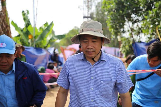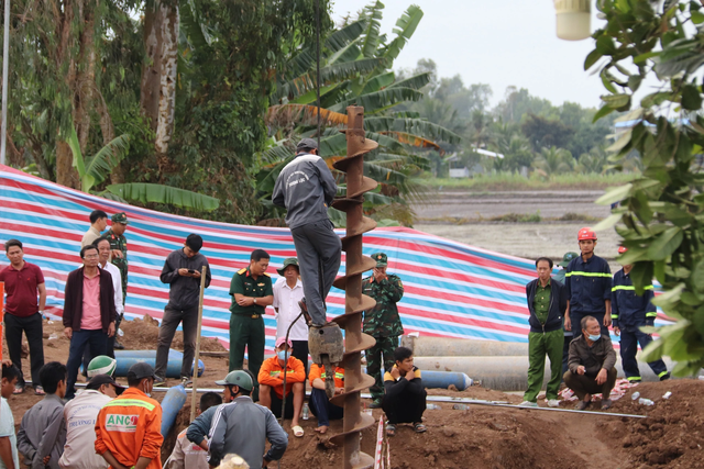 Chủ tịch UBND tỉnh Đồng Tháp - ông Phạm Thiện Nghĩa họp trực tiếp xuống hiện trường chỉ huy việc cứu hộ bé Hạo Nam. Việc triển khai mũi khoan xoắn cứu hộ đang được thực hiện gấp rút. Ảnh: Tiền Phong.