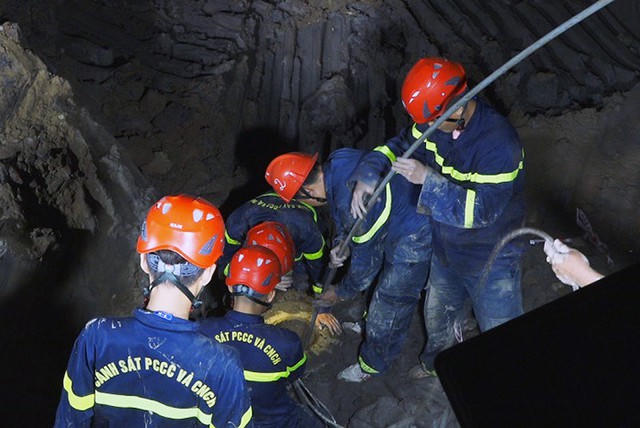 Tại hiện trường do miệng trụ bê tông quá nhỏ, nhân viên cứu nạn không thể thả dây để leo xuống, đồng thời việc mở rộng hố mất nhiều thời gian, gây khó khăn cho việc giải cứu nạn nhân. Ảnh: Dân trí.