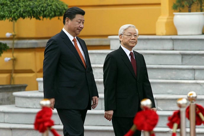 | Tổng bí thư Nguyễn Phú Trọng và Tổng bí thư, Chủ tịch Trung Quốc Tập Cận Bình tiến hành nghi thức chào cờ - Ảnh: Độc Lập |