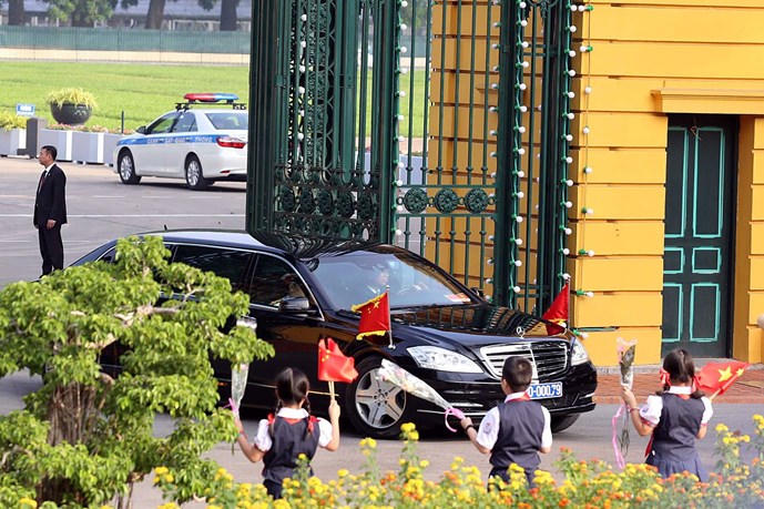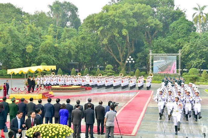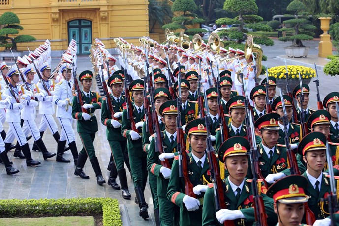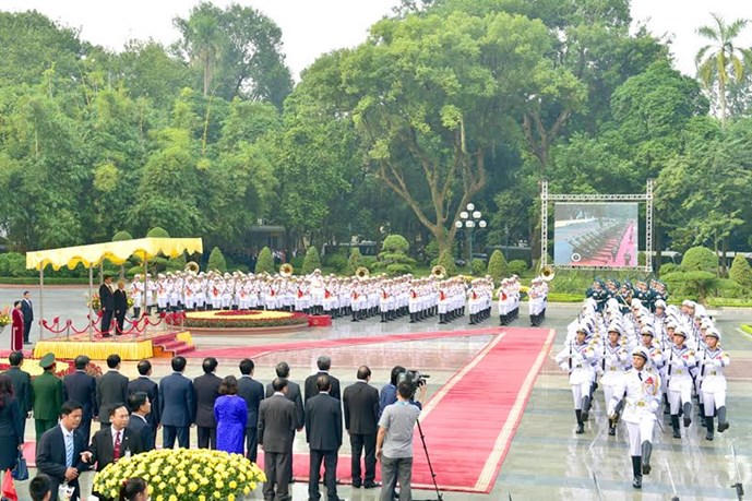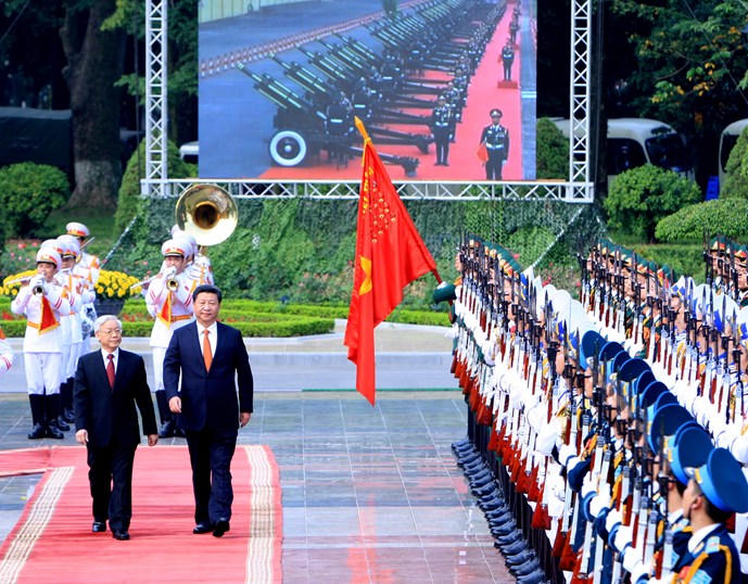 Tổng Bí thư Nguyễn Phú Trọng mời Tổng Bí thư, Chủ tịch Trung Quốc Tập Cận Bình duyệt đội danh dự và chứng kiến Đội danh dự diễu hành. Đoàn thiếu nhi Hà Nội vẫy cờ, hoa nồng nhiệt chào đón Tổng Bí thư, Chủ tịch Trung Quốc Tập Cận Bình và phu nhân cùng Đoàn đại biểu cấp cao Trung Quốc sang thăm Việt Nam.