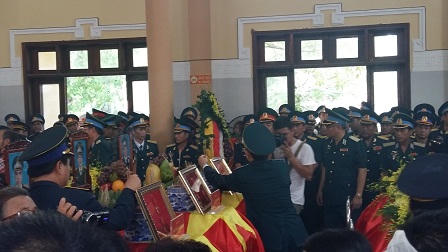 Bên trong nhà tang lễ, di ảnh 9 liệt sĩ xếp thành hàng ngay ngắn. 9 linh cữu ở phía sau phủ quân kỳ quyết thắng cùng những đóa lan vàng. Trong đó có cỗ quan tài trống bởi người chiến sĩ cuối cùng của tổ bay chưa được tìm thấy. Những người lính thời bình, hy sinh khi làm nhiệm vụ tìm kiếm, cứu hộ, cứu nạn đồng đội mất tích trên chiếc Su-30. Lúc sống họ là đồng đội, khi đã khuất cũng ở cạnh nhau.