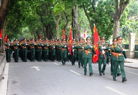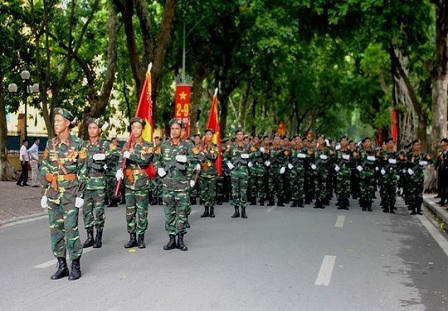| Bên trong các khu vực gần Quảng trường Ba Đình, các lực lượng diễu binh chuẩn bị cho buổi tổng duyệt. |