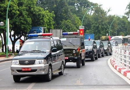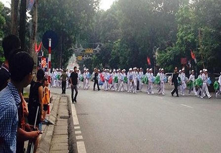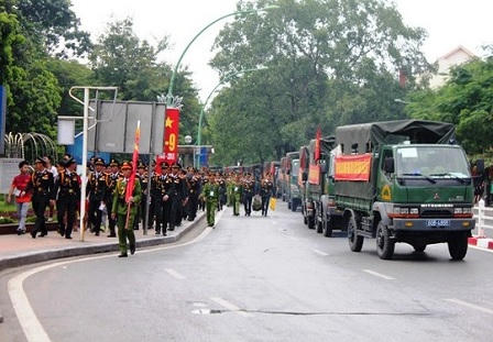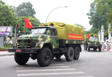 | Khoảng 14 giờ ngày 29-8, hàng trăm xe quân đội công an chở theo lực lượng diễu binh cho buổi tổng duyệt kỷ niệm Quốc khánh 2-9 đi từ hướng đường Thanh Niên vào khu vực Lăng Bác |