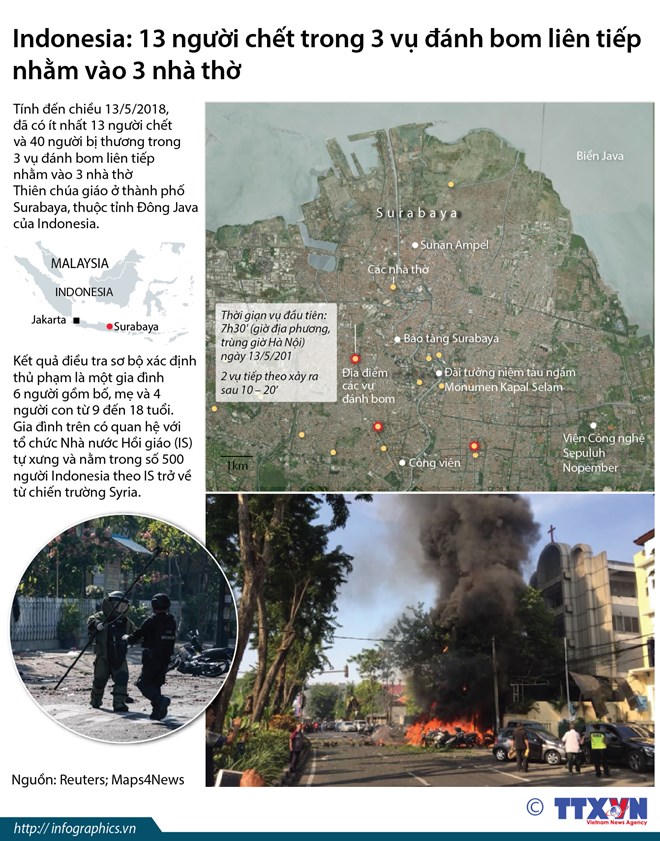 Tính đến chiều 13/5, có ít nhất 13 người chết và 40 người bị thương trong 3 vụ đánh bom liên tiếp nhằm vào 3 nhà thờ Thiên chúa giáo ở thành phố Surabaya, thuộc tỉnh Đông Java của Indonesia.